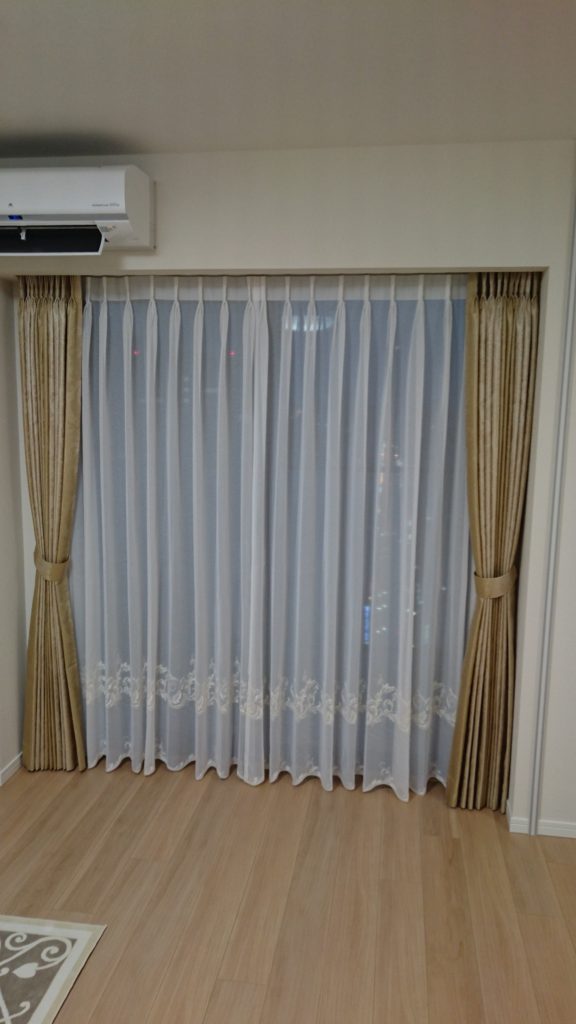 向かって左側にある掃出し窓にはドレープ・レースをレギュラーカーテンでお仕立て、